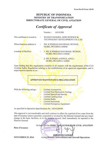 2001年10月 公司獲中國民航總局授權的民航維修許可證。